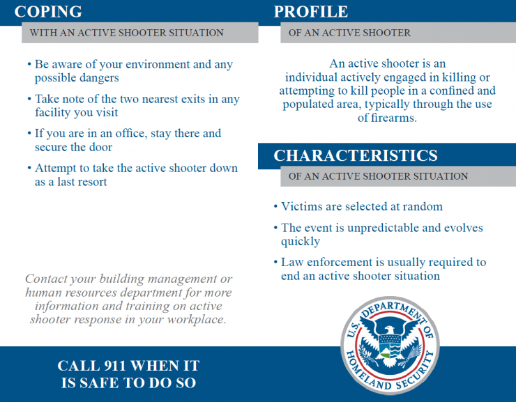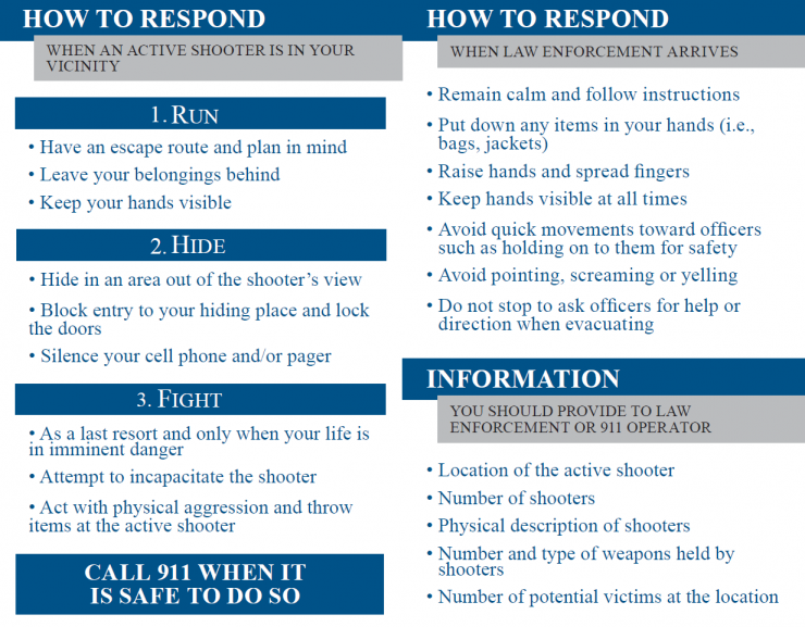 An active shooter is an individual actively engaged in killing or attempting to kill people in a confined and populated area.  Active shooter situations are each unique and dynamic, therefore responses may vary based upon information available at the time of the incident.  Refer to the below guidelines provided by the Department of Homeland Security on to how to respond.